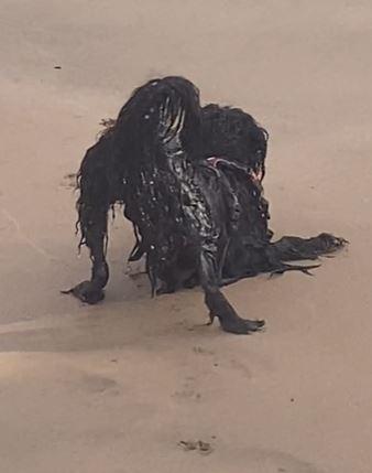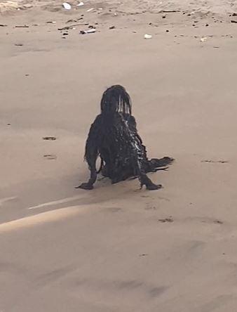 沙灘上有一隻「黑色生物」,渾身佈滿黑色毛髮,毛髮還油膩打結,猶如電影中的怪物。(TikTok)