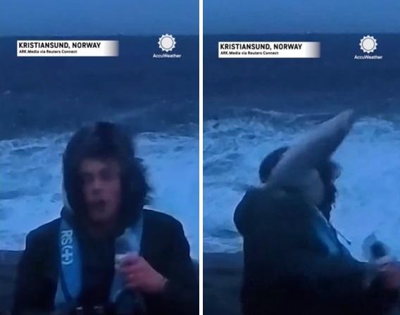A reporter takes a fish to the face before being nearly swept away by a large wave during a storm in Norway. 🌊🐟 pic.twitter.com/02yys59swg