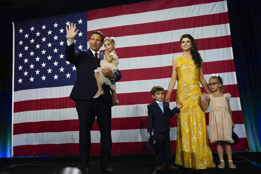 連任成功的德桑蒂斯,與妻子及3名子女向支持者揮手。(美聯社)