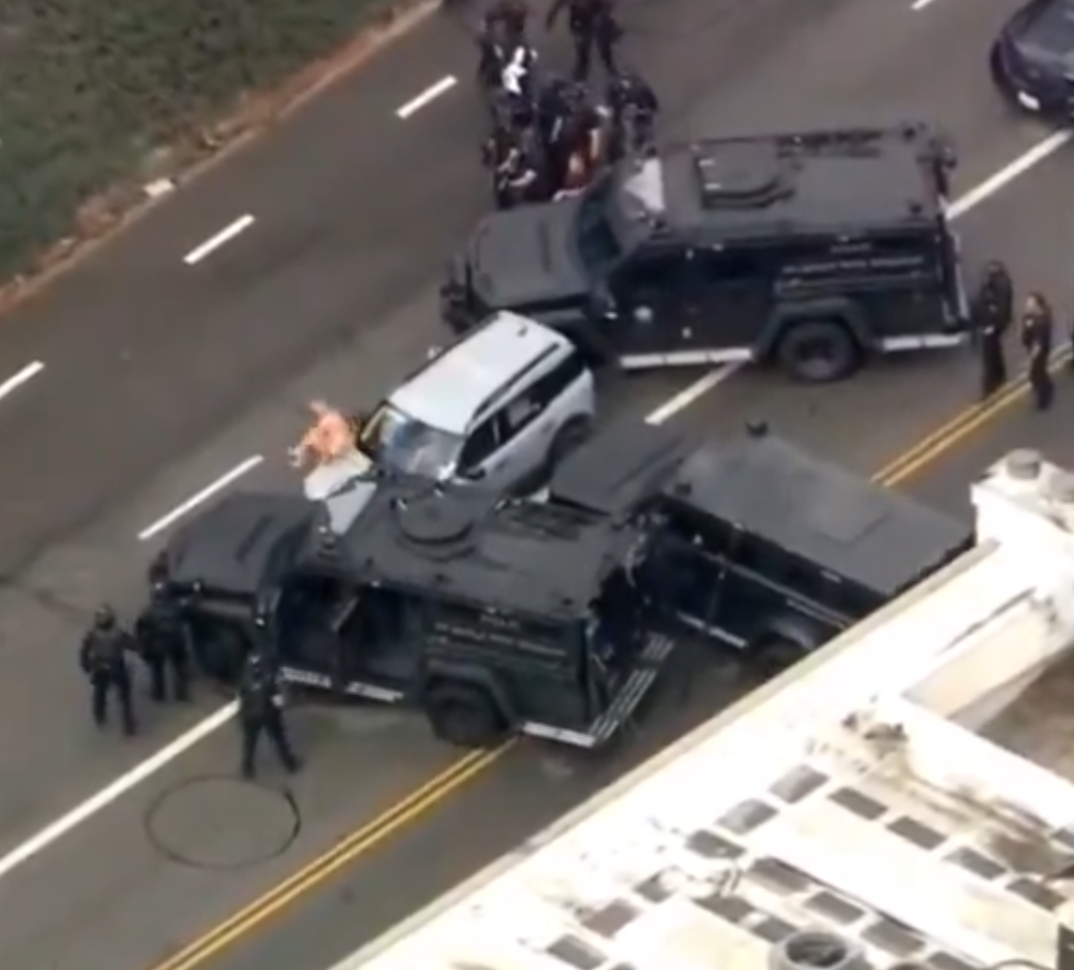 警方出動巡邏車、裝甲車包圍女子,並布設破胎器阻止她再度逃逸。過程中,該女子一度從車窗丟出一把鐵鎚,拒絕下車。一名警官透露,「我們當時非常擔心現場安全,因為她情緒高度不穩。」
