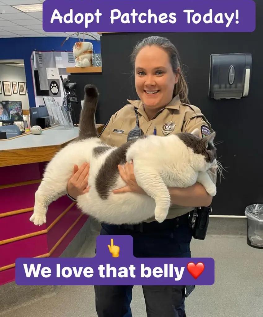 正常的貓咪體重大約在5公斤(約11磅)左右,但一隻名叫補丁(Patches)的貓咪竟然重達18公斤(約40磅)!補丁來自美國維吉尼亞州,主人不知什麼原因將牠帶到收容所棄養,義工們都相當驚訝牠的巨大身型。為了幫補丁找到適合牠的新家,收容所絞盡腦汁寫了可愛的文案,搭配上補丁的肥美模樣,很快就吸引許多人報名想要領養。