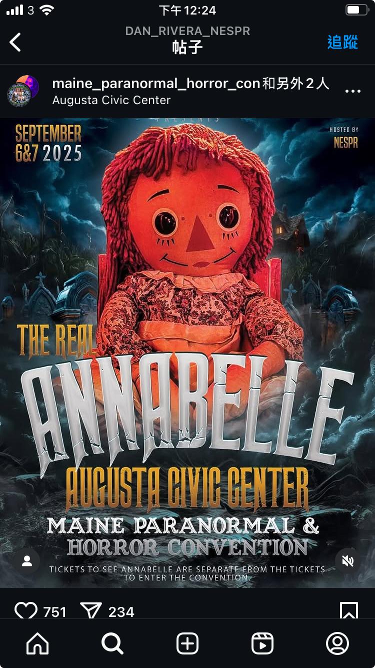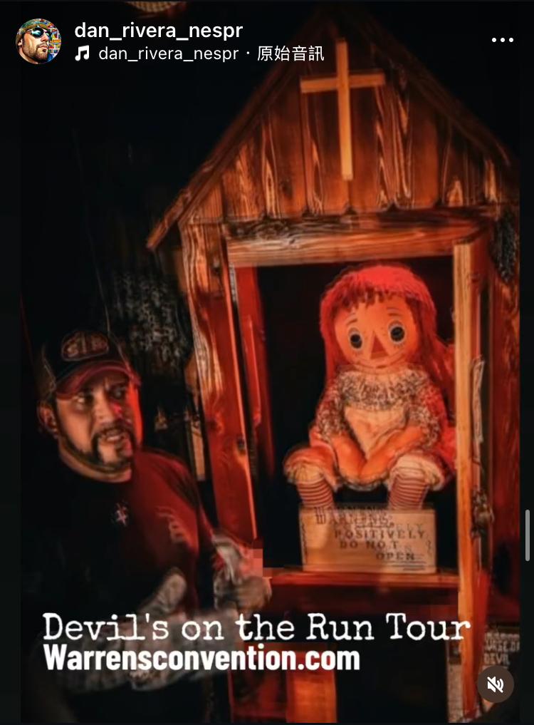 綜合美媒報道,這名男子里維拉(Dan Rivera)曾參與Netflix節目《探靈28天》(28 Days Haunted)等節目,且是「新英格蘭靈異研究會」(NESPR)首席調查員,頗具知名度。近期他與協會成員帶着傳說中被詛咒的安娜貝爾娃娃(Annabelle),進行名為「惡魔奔逃之旅」(Devils on the Run Tour)的巡迴展。