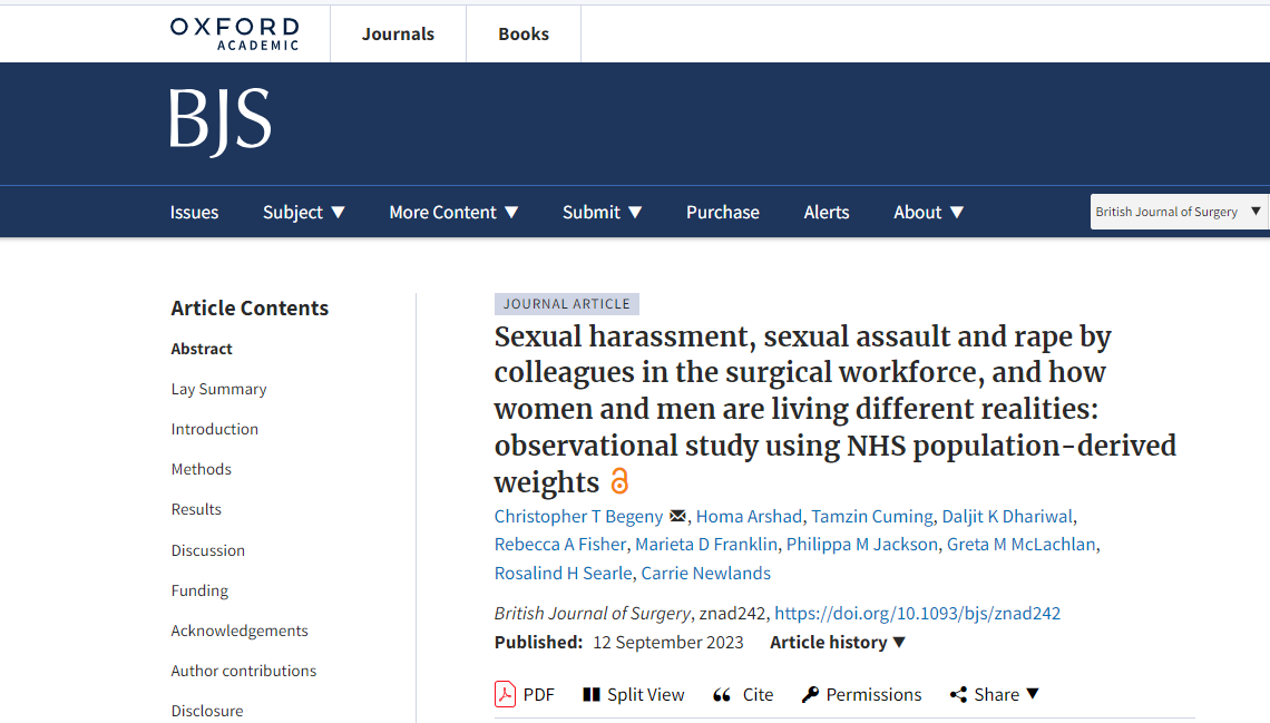 研究由兩間大學艾克斯特大學(University of Exeter)、薩里大學(University of Surrey)和外科僱員性不端行為組織進行,有1,704人參與研究,包括各階層人員,從顧問醫生以至醫科學生。研究發現63%女性和23%男性遭同事性騷擾,當中有29.9%女性稱遭性侵犯,較男性外科人員的6.9%遠為高,所涉性侵行為從生殖器官、胸部遭碰觸或撫摸,以至強姦。報告又指,11%女性外科人員「因事業機會,曾被逼有身體接觸」。除了在工作場所遭強姦,有受訪者稱在教學場所、會議及工餘活動中遭同僚強姦。報道指,參與研究的人多數為顧問醫生和更高級的職員,低階醫生害怕前途受影響不敢受訪。