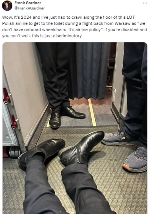 他分享一張他在航班上地板上爬行、只見腿部照片,並寫道:「現在是2024年,我竟然不得不在這架波蘭航空公司的航班上爬到洗手間,因為『我們沒有機艙輪椅。這是航空公司的政策』」。他憤憤不平稱,「若你是殘障人士,就不能(在機上)移動,而這就是歧視」。