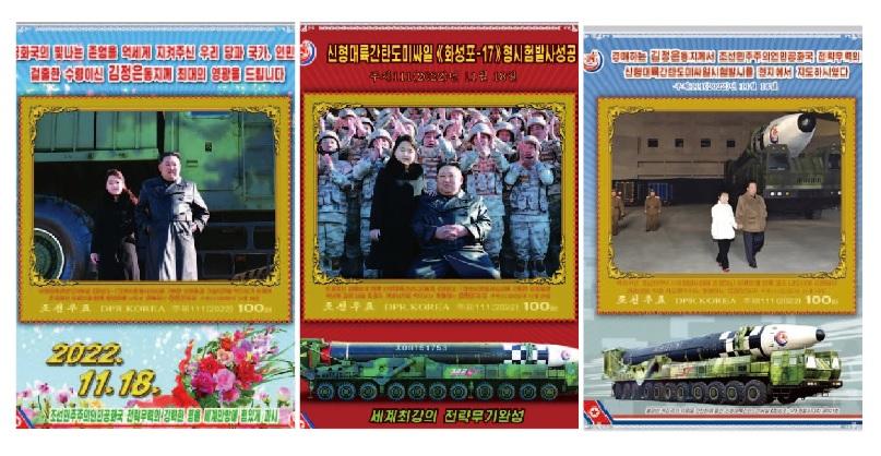 北韓今日公布將於周五發行的新郵票圖稿,領導人金正恩女兒金主愛首次出現在北韓郵票上,8款新郵票她佔了5款,是她去年11月18日陪同父親視察「火星17」洲際導彈時拍攝。金主愛亮相其中5款郵票,包括與金正恩以導彈為背景、手牽手並排走和挽著手臂,也有父女與北韓士兵的合照。其餘3款分別為導彈照片和金正恩的照片。以父女為中心的郵票下方還附有導彈照片,以及寫有「向全世界展示不敗的核強國威容」、「向全世界展示北韓戰略力量、絕對力量」及「無上光榮屬於金正恩同志」等宣傳語句。