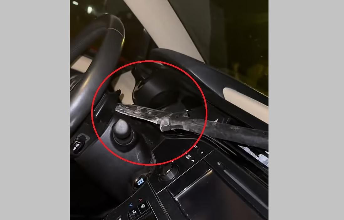 金屬長矛穿過擋風玻璃,直插司機位的軚盤。(互聯網)