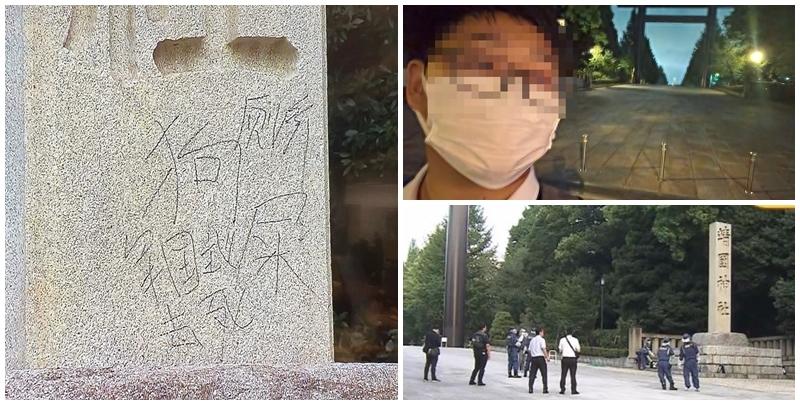 靖國神社今年8月被人塗鴉石柱,疑犯涉用黑色筆在石柱以簡體中文寫下「廁所」、「狗屎」、「軍國主義」和「去死」。