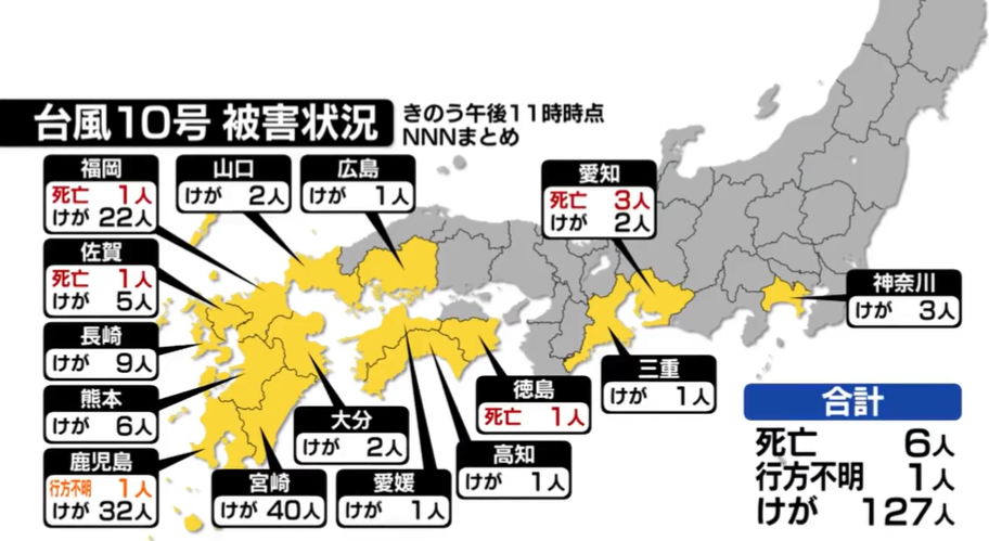 一名住在佐賀縣鹿島市的80多歲男子,被發現臥倒在神社參道上,失去意識,確認已經死亡。佐賀縣當局判斷,死者是被強風吹倒地。另據統計,颱風已在日本全國共造成超過127人受傷。