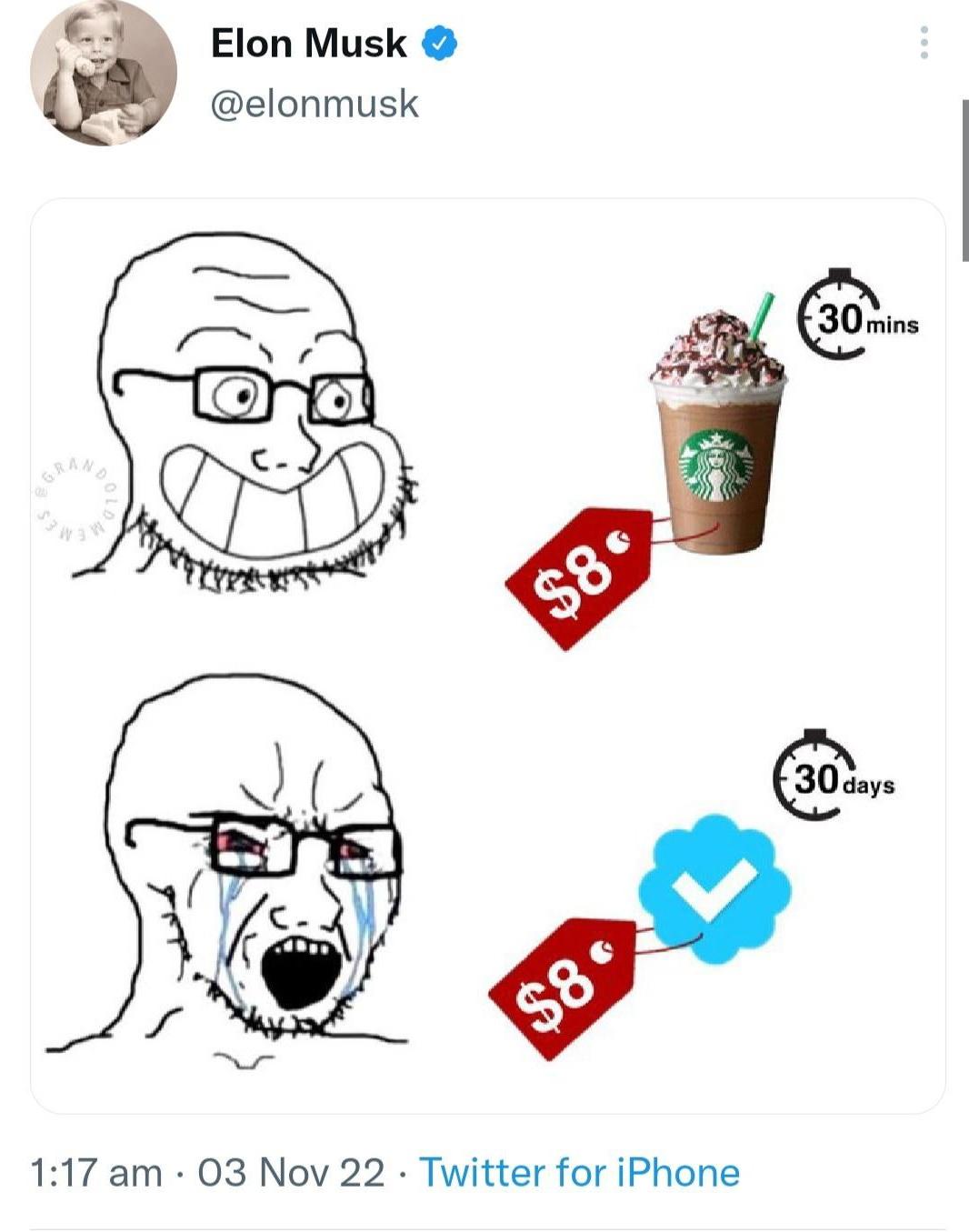 除了回應用家投訴,馬斯克又在個人戶口頻頻出招,先後有meme圖寸爆網民願意以8美元買一杯星巴克咖啡享受30分鐘,而不肯每月以8美元於Twitter認證藍剔享受Free Speech。又直線抽擊所有批評者:「致所有投訴者,繼續投訴吧,但這會需要8美元。」網民一方面大讚馬斯克做事親力親為,另一方面恥笑他是個小學雞。