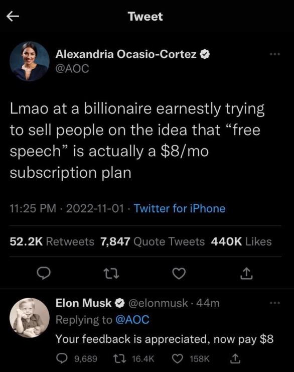 作為最勤力的CEO加Twitter重度用家,馬斯克頻頻於Twitter出擊親手回應用家帖子。美國眾議員奧卡西奧科爾特斯於周二便發帖,批評「地球上最有錢的億萬富豪向你推銷言論自由是每月8元」,馬斯克旋即留言指「感謝你的回應,現在支付8元吧」。