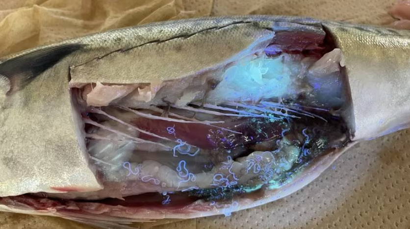 鯖魚內的寄生蟲在紫外燈下一目了然。(互聯網)