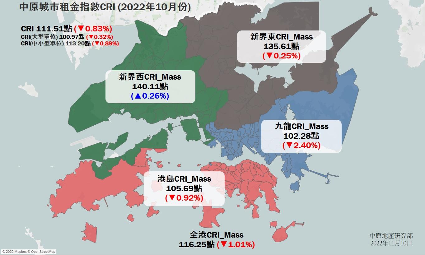 10月份四區租金呈三跌一升,帶動整體租金回軟。港島CRI_Mass報105.69點,創76個月新低,重返2016年6月水平,按月跌0.92%,連跌四個月共4.23%。九龍CRI_Mass報102.28點,創三個月新低,按月跌2.40%,連升兩個月後回軟。新界東CRI_Mass報135.61點,創三個月新低,按月跌0.25%,連跌兩個月共1.47%。而新界西CRI_Mass報140.11點,按月升0.26%,連跌兩個月後回升,近4個月企穩140點上下。
