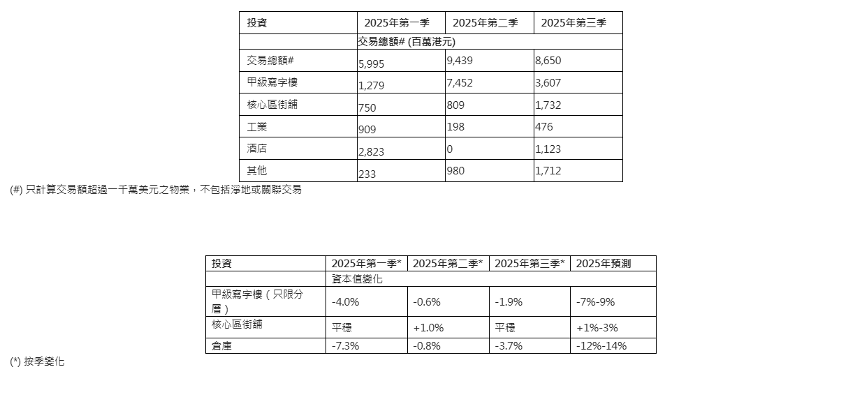 美聯儲在9月17日降息25個基點,香港最優惠貸款利率隨之下調12.5個基點至5.125%-5.375%。然而,由於流動性收緊,一個月期銀行同業拆息(HIBOR)從6月30日的0.73%大幅上升至9月30日的3.54%。因此,各商業地產板塊再次出現負收益率。2025年第三季總投資金額(交易金額超過 7,700萬元,不包括純土地或相關交易)按季下降9%至86億元,年初至今總額為240億元,僅佔2024年全年總額的56%。