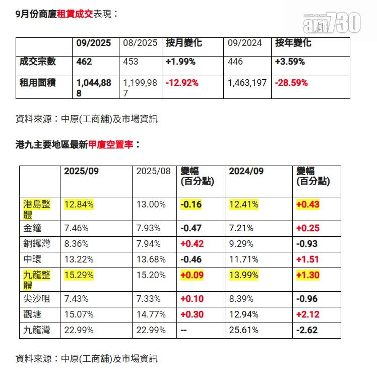 至於甲廈空置率方面,陳雁樓指出,港島區甲廈空置率稍微回落,9月份整體錄得12.84%,較上月減少0.16個百分點,比去年同期則上升0.43個百分點。而各區空置率各自發展,金鐘及中環區9月份空置率為7.46%及13.22%,分別按月回落0.47個百分點及0.46個百分點,按年則增加0.25個百分點及1.51個百分點。銅鑼灣區甲廈空置率則錄得8.36%,按月回升0.42個百分點,按年大幅減少0.93個百分點。