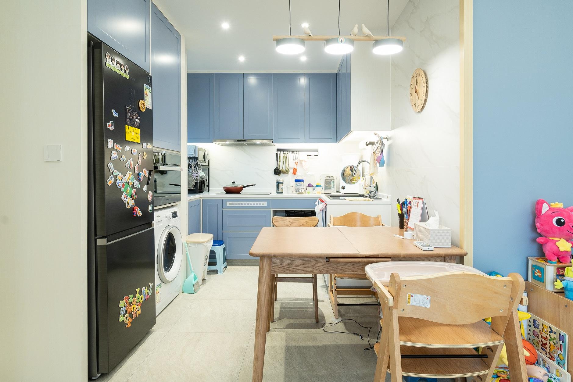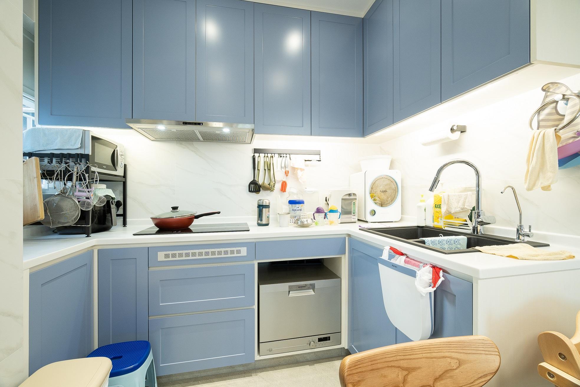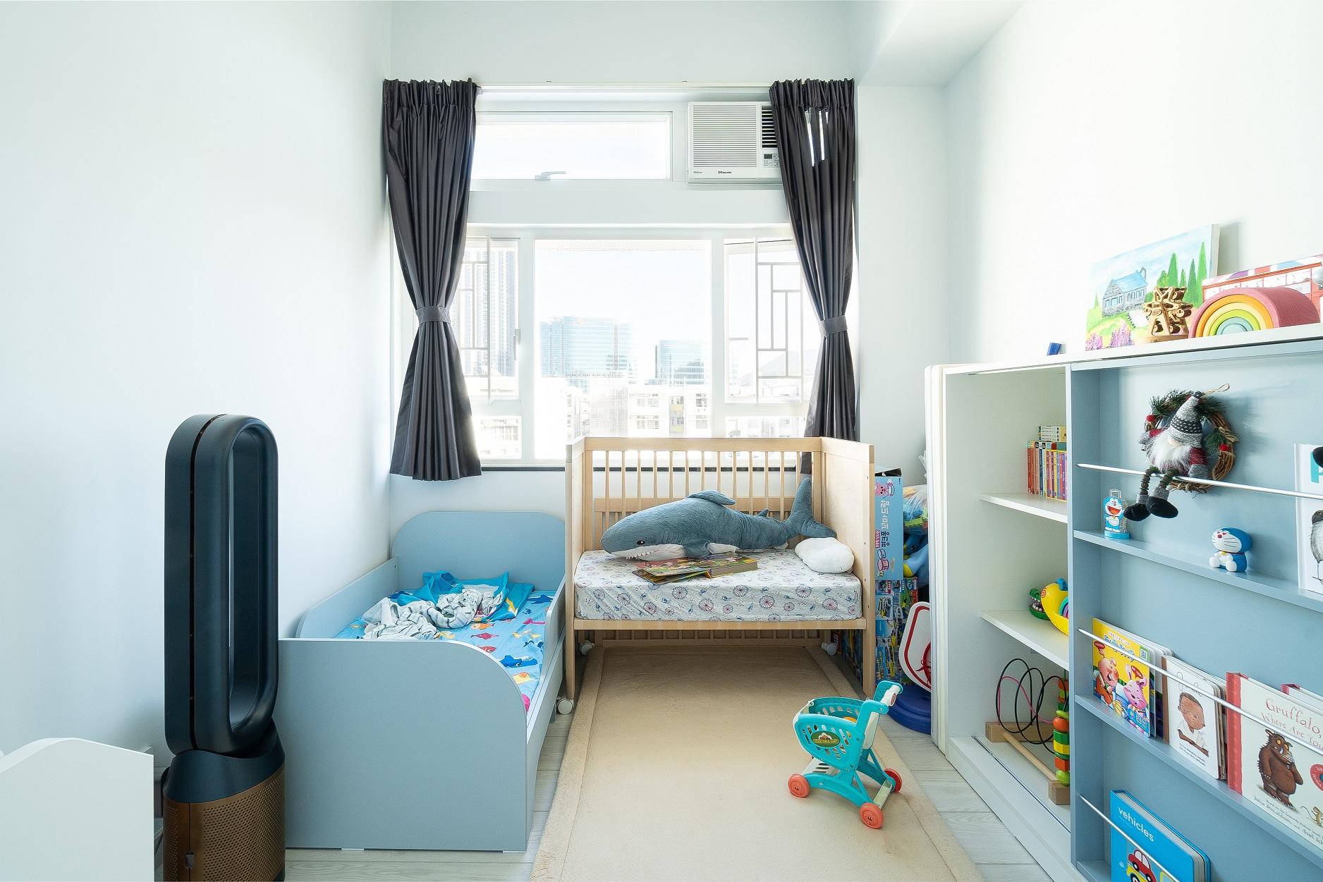 客廳一邊的牆身髹上了粉藍色,與廚房的藍色廚櫃互相呼應,小孩房的床、櫃都沿用了粉藍色,統一全屋的色調,亦增添了單位用色的層次感及活潑感,更有北歐風的感覺。