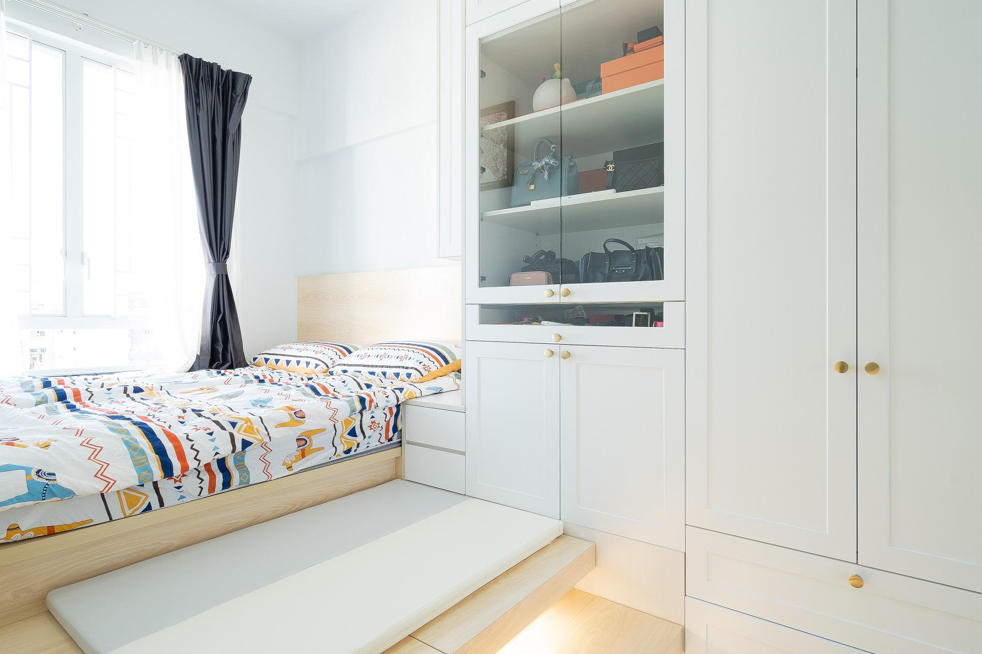 戶主在客廳新間了一幅間牆櫃,面向客廳的一邊變成電視牆,並整合了電線藏進牆身,背後改成書房,令到空間視覺更為乾淨及完整,在大廳亦擺放了各式各樣的兒童玩樂設施,儼如變成了他們的小天地。主人睡房亦設了地台床,方便收納衣物及雜物。