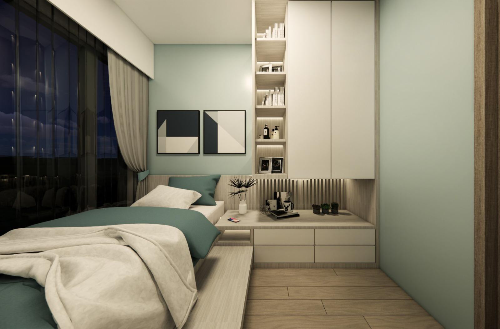主人睡房可間成套房設計,是居屋較罕見的間隔,主人房用色與客廳統一,靠近窗邊擺放雙人睡床,睡床旁邊的吊燈,有點綴空間氣氛的作用。造到頂的衣櫃增加儲物的空間。至於另一間睡房擺放單人睡床,牆身髹上較淡雅的綠色。