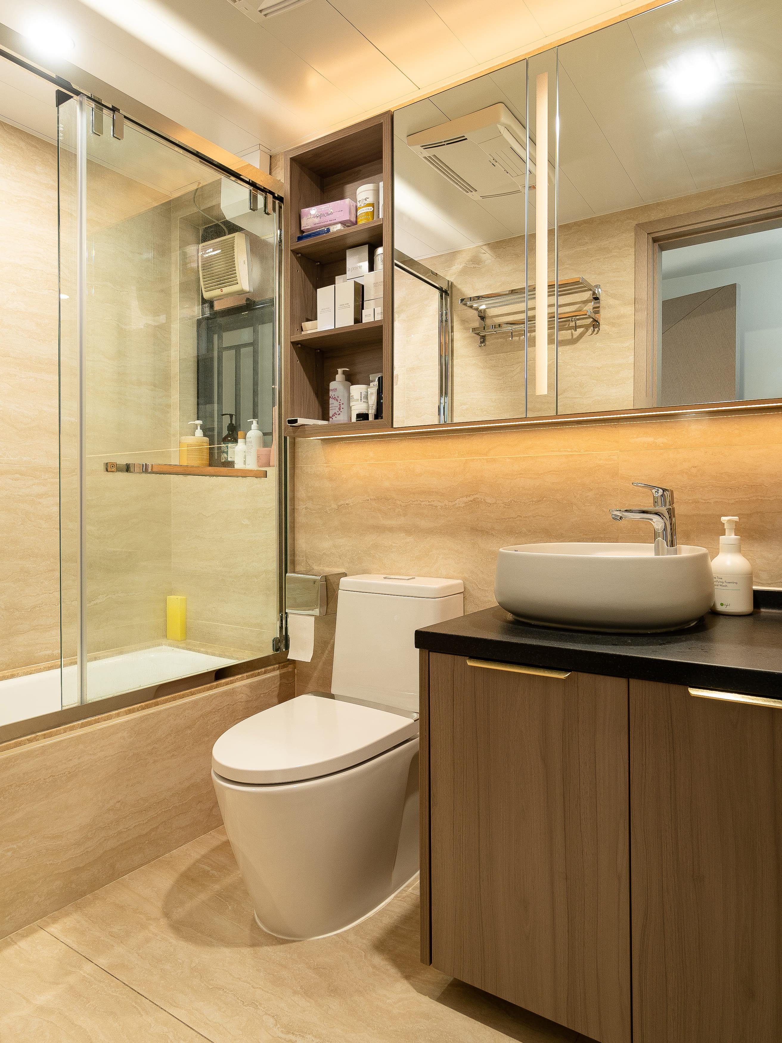 雖然戶主只是一人居住,但平時喜歡相約朋友共聚到家中品酒聊天,所以飯廳位置擺了一張多人餐桌,而戶主又特別喜歡雲石紋,所以特別選了一張雲石紋餐檯,而客廳一邊亦有一張吧檯作為品酒區,都是比較獨特的設計。
