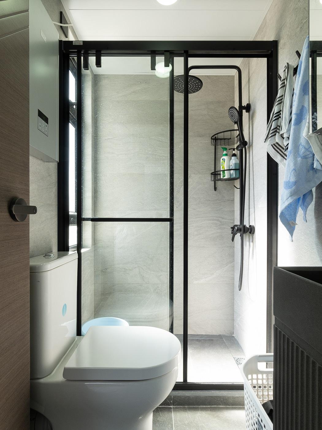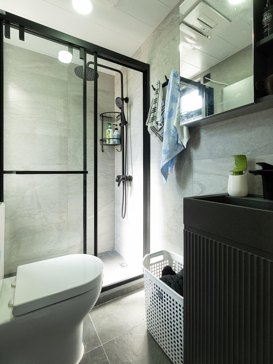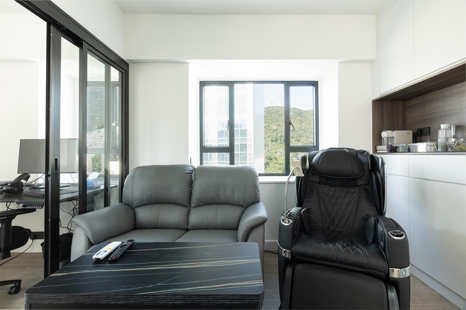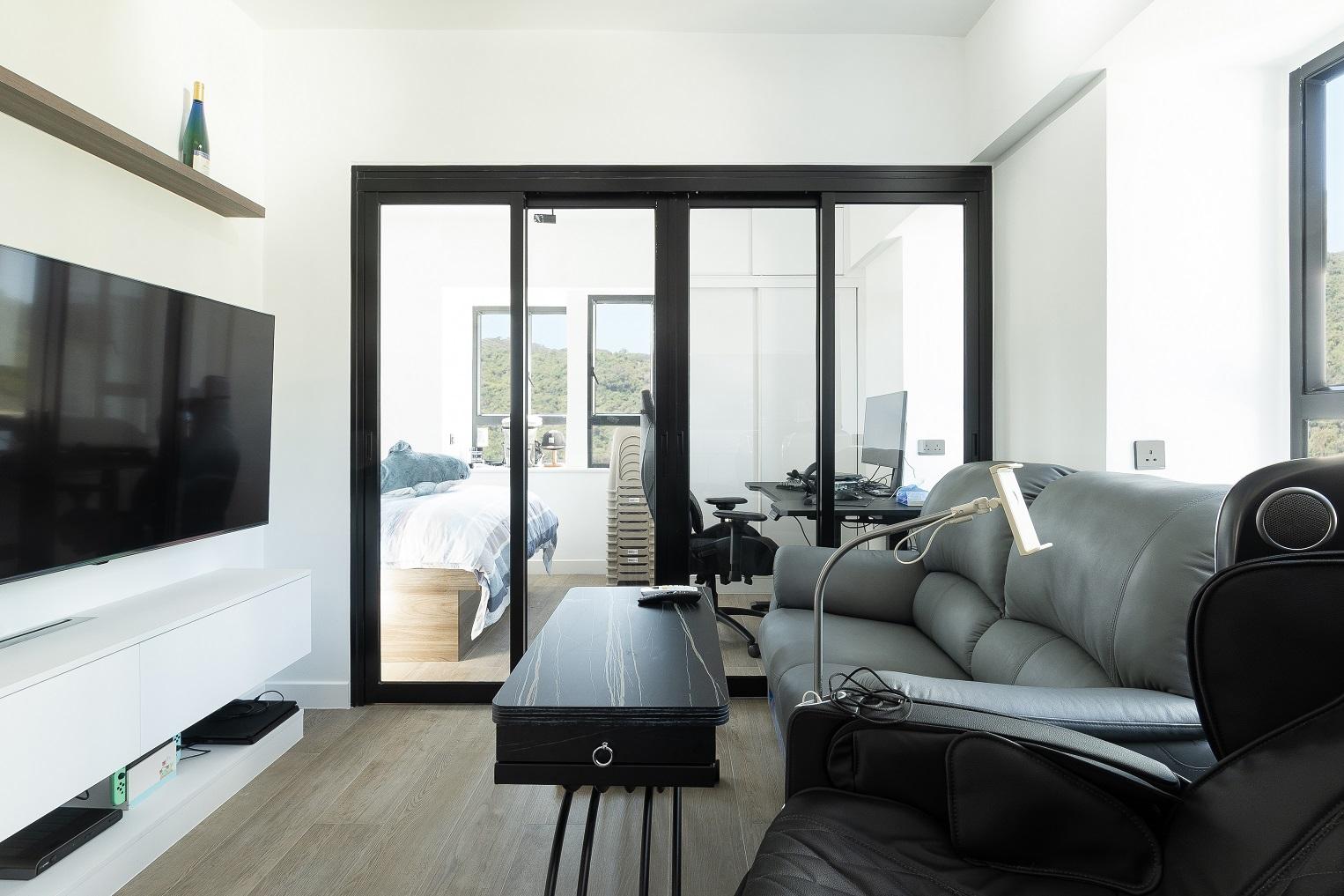 首先,大門門框、玻璃趟門的門框、所有窗框,及浴室屏風的邊框皆選用了型格黑色,再搭配上清玻璃,更突顯帥氣風格。此外,戶主亦特意選購了黑白灰的傢俬,如黑色桌子和廚廁櫃、灰色梳化,以及白色高身櫃等。經典不敗的黑白灰組合讓單位看起來乾淨俐落、型格帥氣,成功打造出戶主一直以來心目中的理想家居。