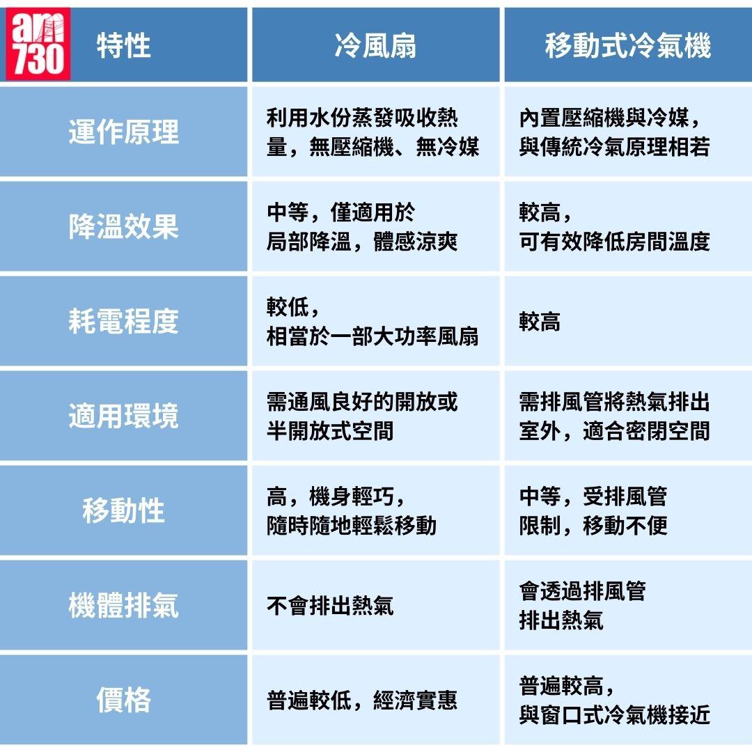 由於外形相似,許多消費者經常將冷風扇與「移動式冷氣機」混淆。這兩者雖然都標榜「流動」和「降溫」,但其運作原理和適用環境截然不同。下表羅列出兩者的主要分別: