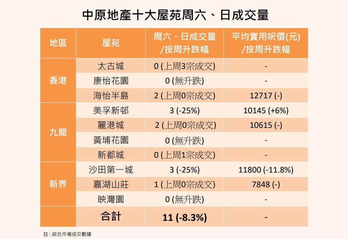 據中原地產統計,十大屋苑於周末兩日(24及25日)合共錄得11宗成交,雖然較上周末減少1宗,惟仍連續4周末錄得雙位數。