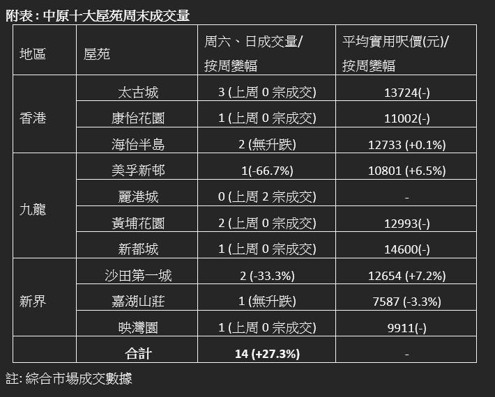 減息預期逐漸升溫,二手交投氣氛回暖。據中原地產統計,十大屋苑於周末兩日(8月31日及9月1日)共錄得14宗成交,較上周末的11宗,增加3宗或27.3%,連續5周末錄得雙位數,更創3月尾迄今接近半年新高,當中鰂魚涌太古城錄得3宗表現最旺,只有藍田麗港城一個屋苑「食白果」。