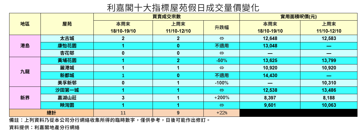 廖偉強續指,現時買家入市步伐加快,市場整體保持良好狀態,預期未來市況將往穩中向好方向發展。統計利嘉閣地產分行網絡數據,在過去的周末(10月18至19日)十大指標屋苑錄得11宗二手成交,較對上一個周末(10月11至12日)的9宗,按周升約22%,重返雙位數水平。