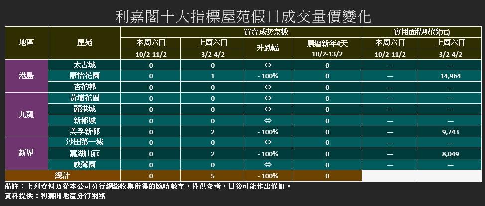 綜合利嘉閣地產分行網絡數據,在過去的周六日(10至11日)十大指標屋苑未有錄得成交,較對上個周六日(3至4日)的5宗大減100%,亦比去年年三十晚及大年初一周末錄得的10宗淡靜,一舉打破近210個周末(即逾四年)新低,對上一次錄「零成交」的周末為2020年2月1至2日,當時正值新冠疫情爆發初期;至於農曆新年4天長假交投亦為0宗。