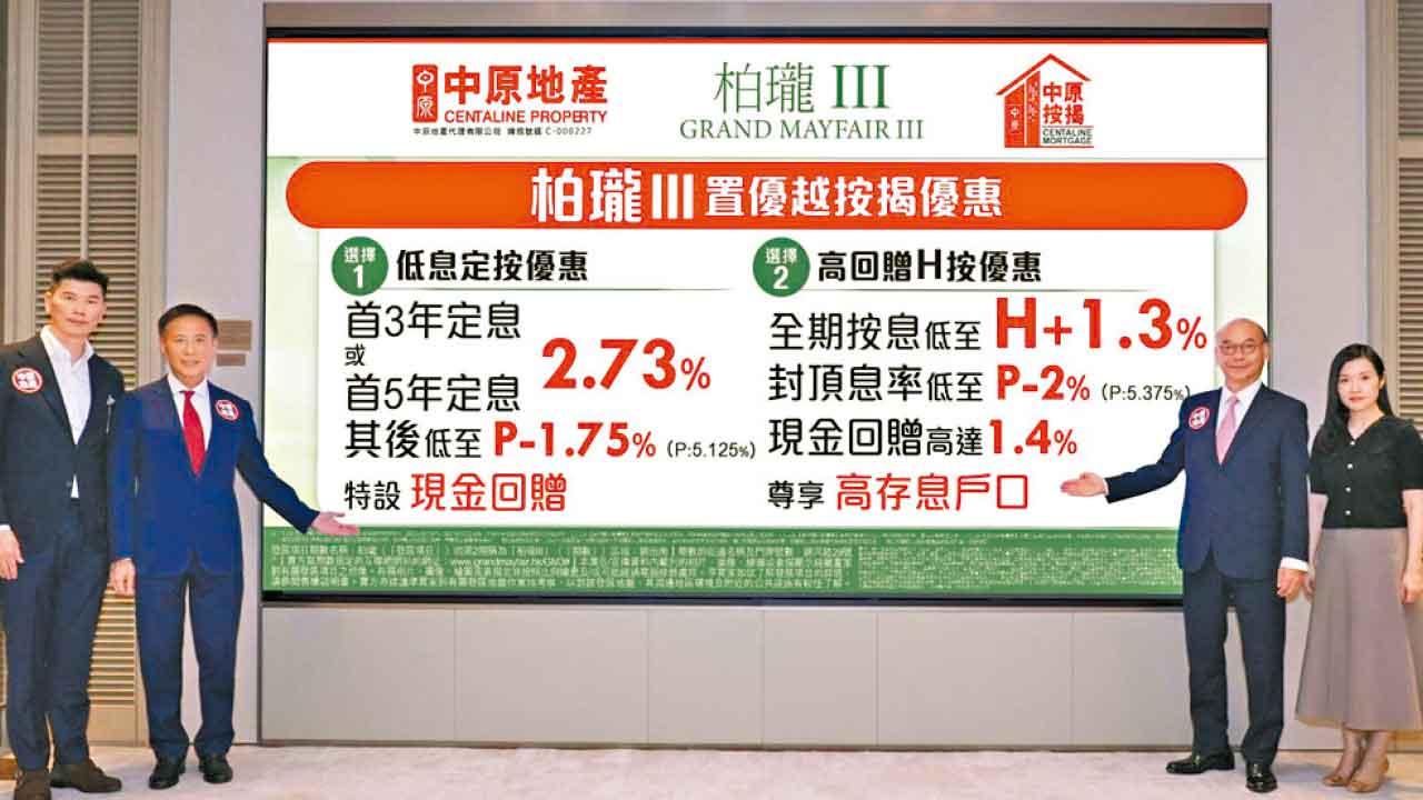 中原地產及中原按揭特別為「柏瓏 III」買家特設全新「柏瓏III GRAND MAYFAIR III」置優越按揭優惠,凡經中原按揭轉介可申請多元化樓按優惠,包括「低息定按優惠」及「高回贈H按優惠」,前者首3年或首5年定息2.73厘,其後按息低至P減1.75厘,與市場H按封頂息一致;後者全期按息低至H加1.3厘,封頂息保障低至P減2厘設現金回贈高達貸款額1.4%。中原按揭董事總經理王美鳳表示,兩計劃各具優勢,買家可選擇透過按保計劃申請高達九成按揭,以「柏瓏 III」首張價單一房折實入場價為466.6萬元計,即低至一成基本首期46萬多元,按揭年期長達30年。