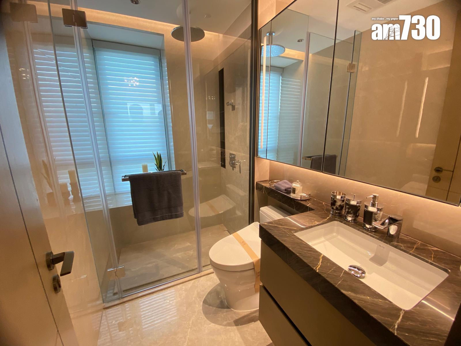 主人套房位於睡房區末端,睡房設計採用大玻璃窗,提供充足的自然光線並展現開揚景觀。房內空間靈活實用,放置1.8米雙人床後仍感寬敞,通往主人浴室的走廊更預留有衣櫃位置,打造專屬衣帽間,為住戶提供充足的收納空間,既實用又增添生活便利性。主人浴室配備三件頭,設有淋浴間、洗手盆及坐廁,打造清爽舒適的優越淋浴環境。