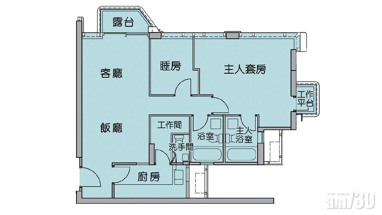 示範單位以第1座8樓B室為藍本,實用面積828平方呎。圖為第1座8樓B室開則。