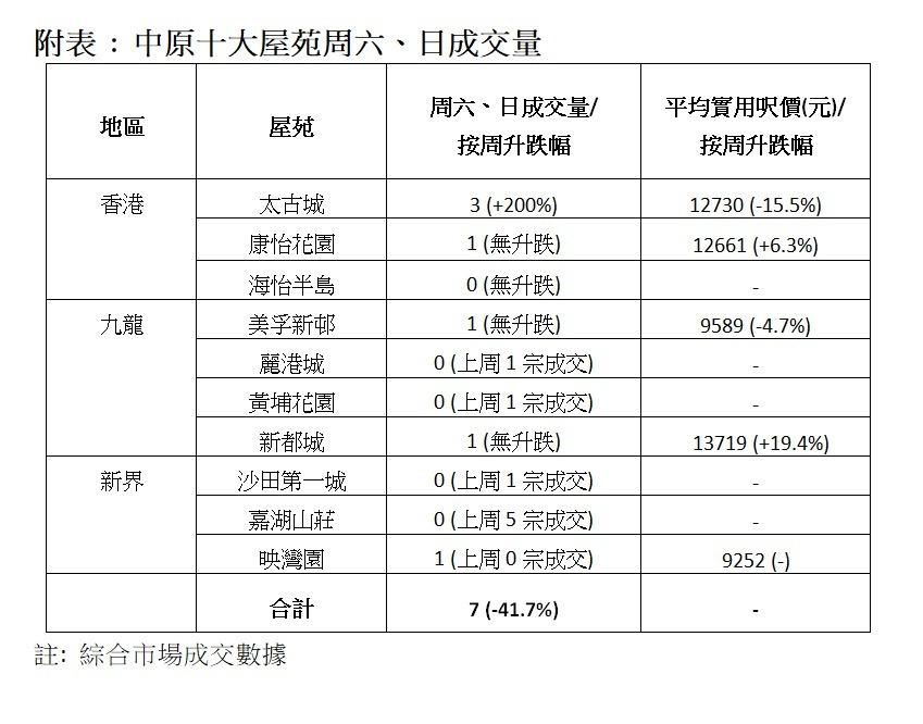 中原十大屋苑本周末7宗成交 按周跌41.7% 重返單位數 一半屋苑零成交