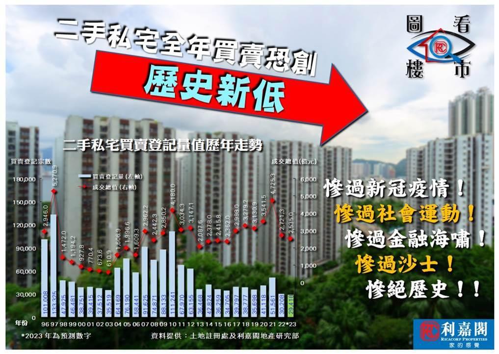 利嘉閣地產研究部主管陳海潮表示,二手私樓買賣登記在今年首季衝高後,即連季回落,本季減辣措施可望成為樓市轉捩點,登記量可望止跌回升;惟全年埋單計數,仍有機會少於3萬宗,恐創1996年有史以來新低,更指情況「慘過新冠疫情、慘過社會運動、慘過金融海嘯、慘過沙士、慘絕歷史!」