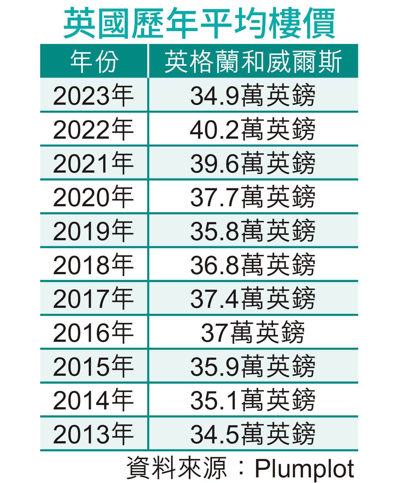 正當大家覺得香港樓市不斷尋底、重回2015年樓價時,英國樓市亦不遑多讓,蒸發近3年升幅,英國樓(僅包括英格蘭及威爾斯地區)平均價格按年挫13.2%。事實上,受惠於2019年起大量港人移英、英國政府寬免印花稅,以及幫助首置買家政策等因素的瘋狂催谷下,物業平均樓價由2019年的35.8萬英鎊(約351萬港元)拾級而上。及至2022年升逾12%,至40.2萬英鎊(約395萬港元)後見頂回落(見圖表),踏入今年則因應通脹及高息環境下,平均樓價最新報34.9萬英鎊(約345萬港元),重返3年前水平。