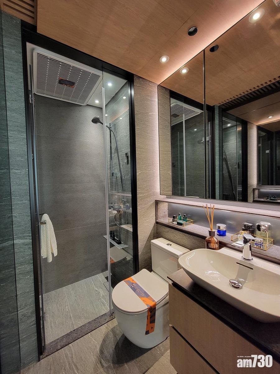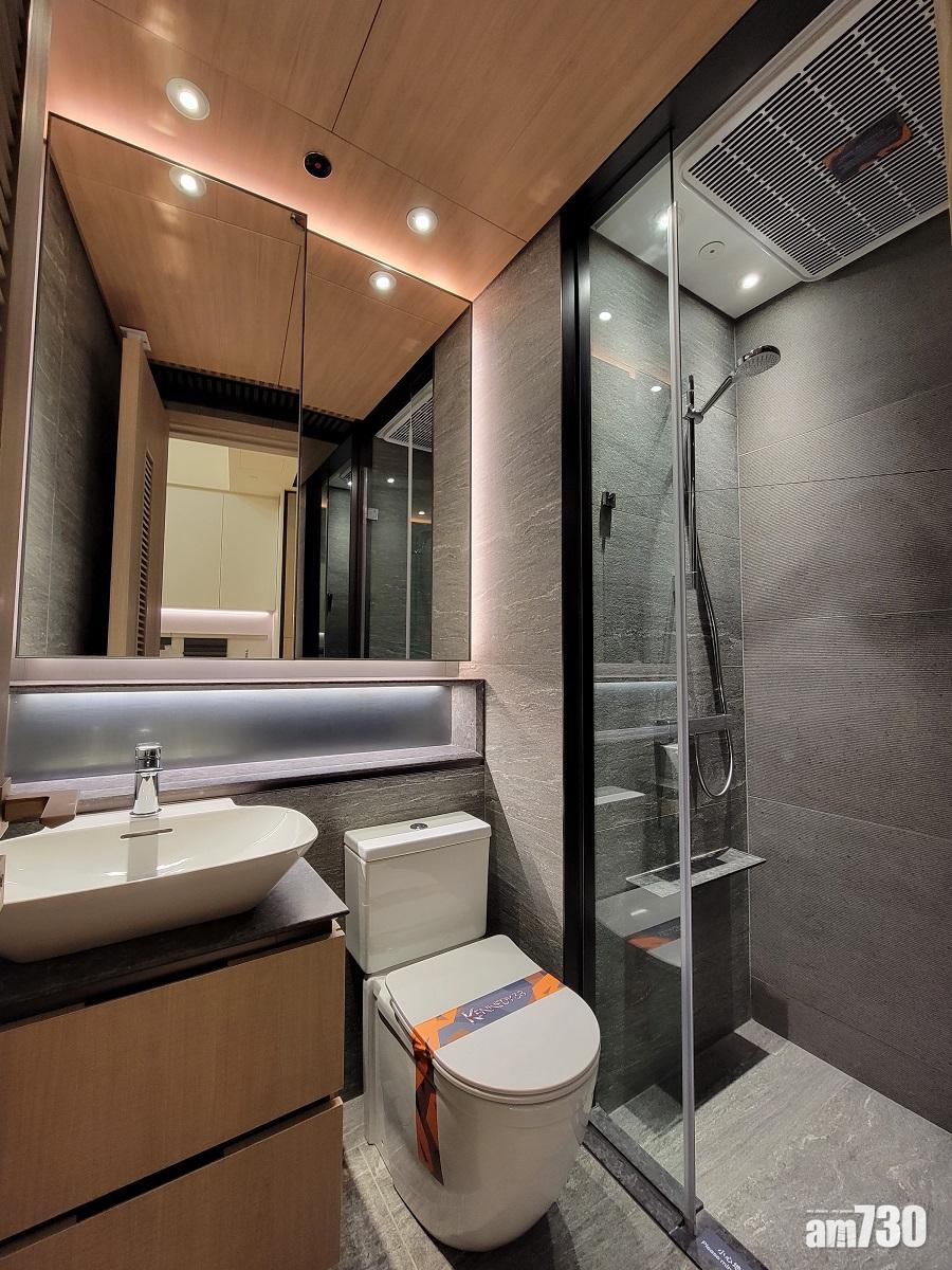 浴室設有三件頭浴室配備,包括淋浴間、洗手盆及坐廁,更配備掛衣繩、具暖風功能的抽濕機及鏡櫃。(鍾式明攝)