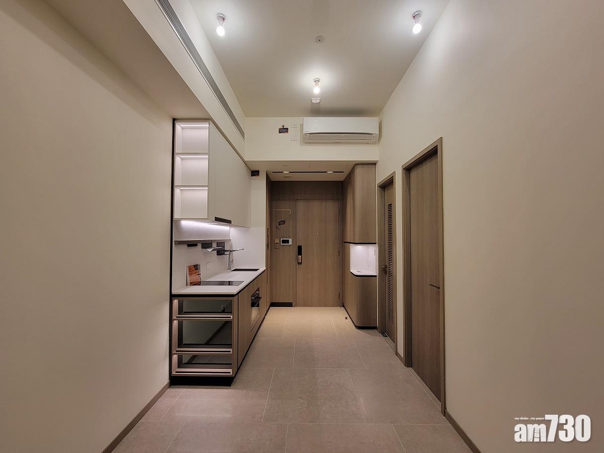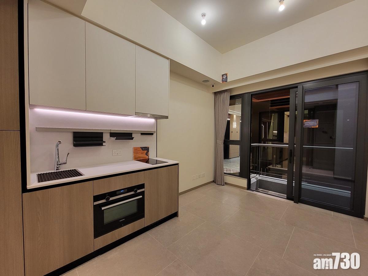 開放式廚房設有高雅米色廚櫃,配備電磁爐、抽油煙機等家電,而雪櫃及洗衣乾衣機更裝嵌於貯物櫃中,並備有摺疊式餐枱。(鍾式明攝)