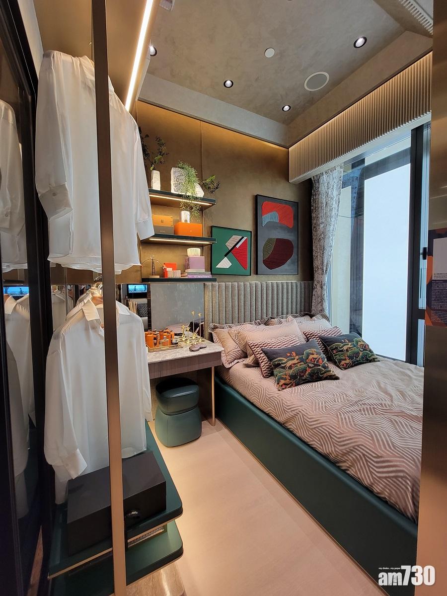 睡房放置深綠色皮革雙人床,床頭位置擺放棕灰色雲石紋理梳妝檯及深綠色皮革椅子,並設置一組精緻淺綠色層架和金屬服飾掛架。(鍾式明攝)