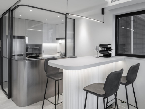 使用光澤感的櫃子或桌面,如高光白色的廚櫃,增強現代感並提升空間的明亮度。