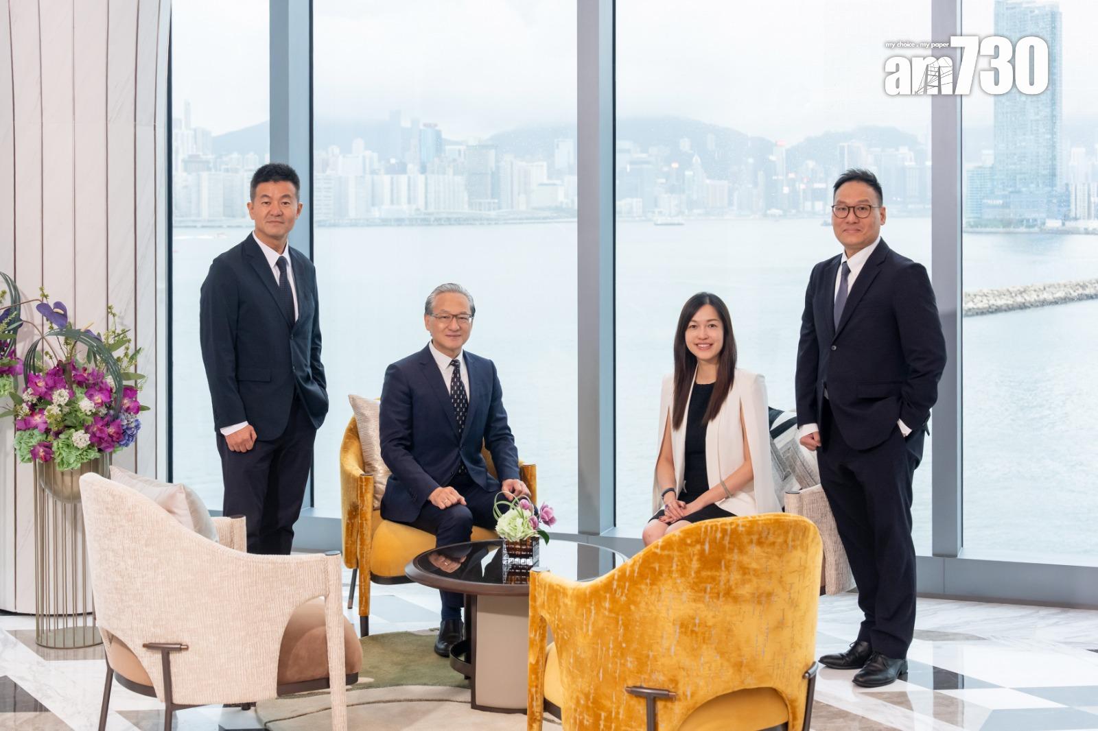 中國海外地產有限公司董事總經理游偉光(左二)﹑助理總監何家宜(右二)﹑高級銷售經理陳國華(左一)及高級銷售經理溫偉華(右一)於臨海住客會所Club Voyage內拍攝。