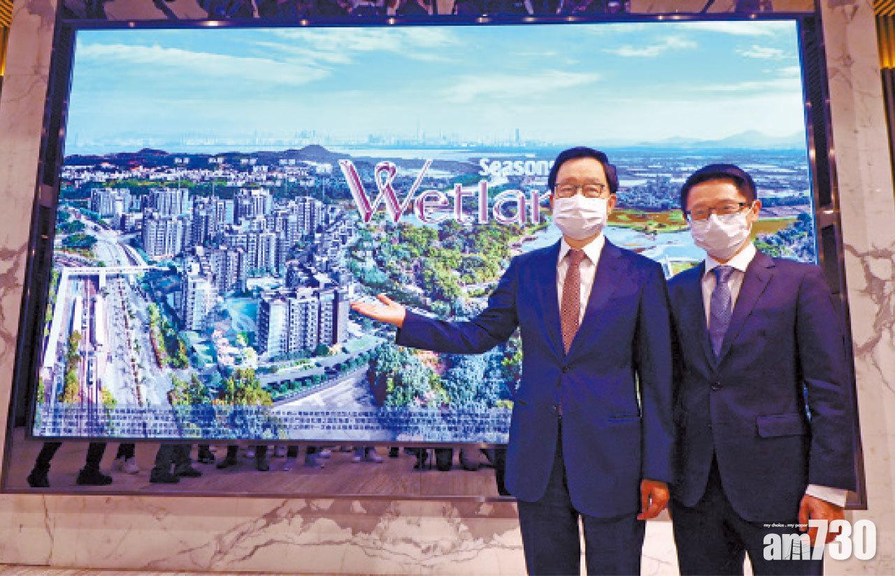 新界西迎來「千伙新盤」!新鴻基地產(016)天水圍濕地公園項目第一期命名為Wetland Seasons Bay,整個項目計劃分三期發展,提供1,998伙。副董事總經理雷霆稱,第一期涉1,224伙,料最快月內獲批預售樓花同意書,將隨即推售。單位間隔涵蓋開放式至四房,當中70%為兩房或以下,預計樓花期約一年。項目毗鄰輕鐵濕地公園站,並提供約3萬方呎商舖樓面。