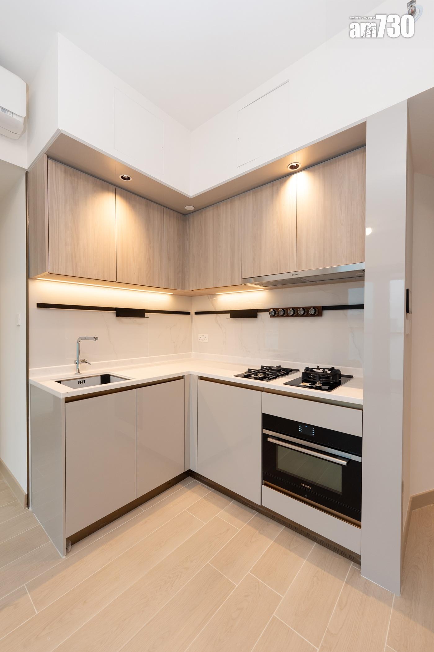 開放式廚房為L型設計,同時善用高樓底優勢,廚房上方位置設置大量儲物櫃,增加收納空間。工作台備有三腳插座、USB插座,方便住戶日常煮食。廚房設備齊全,設有Siemens雙頭煤氣煮食爐、抽油煙機、七合一微波蒸烤焗爐、Whirlpool洗衣乾衣機,更特意安排煤煮食爐及洗滌盤於工作台兩邊不同位置,為住戶提供最便利的煮食環境。