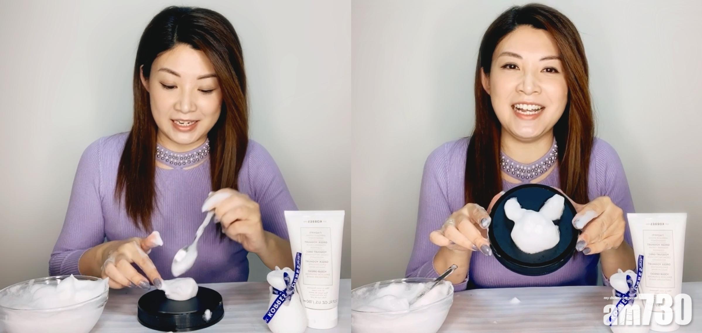 張文采更親自拍片教學,示範如何用不含起泡劑的潔面乳,配合起泡網,不用1分鐘,就已經有大量綿密的奶泡。然後只用了湯匙就砌出可愛的兔仔圖案,網民大叫神奇,更說可以去Playgroup教學,鼓勵小朋友在疫情下勤洗手。