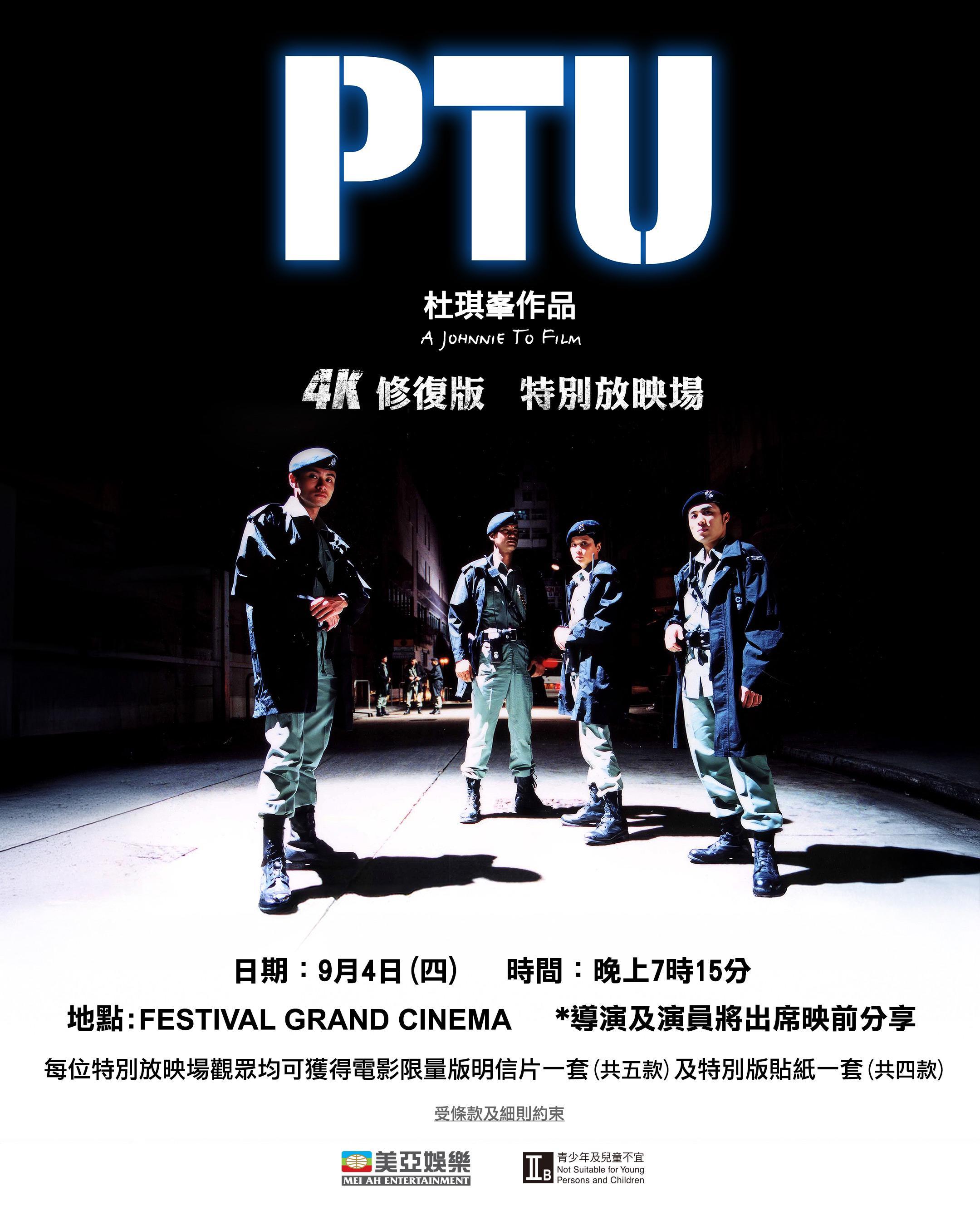 杜琪峯監製兼執導經典電影之一《PTU》,由任達華、邵美琪、林雪領銜主演,被譽為港產警匪片教科書,電影將於9月6日起於各大戲院大銀幕高清重現4K修復版。為隆重其事,早前於日本北海道擔入開球禮嘉賓的導演杜琪峯,將於9月4日聯同任達華、邵美琪、黃浩然出席特別場,於電影放映前與觀眾分享當年拍攝點滴。