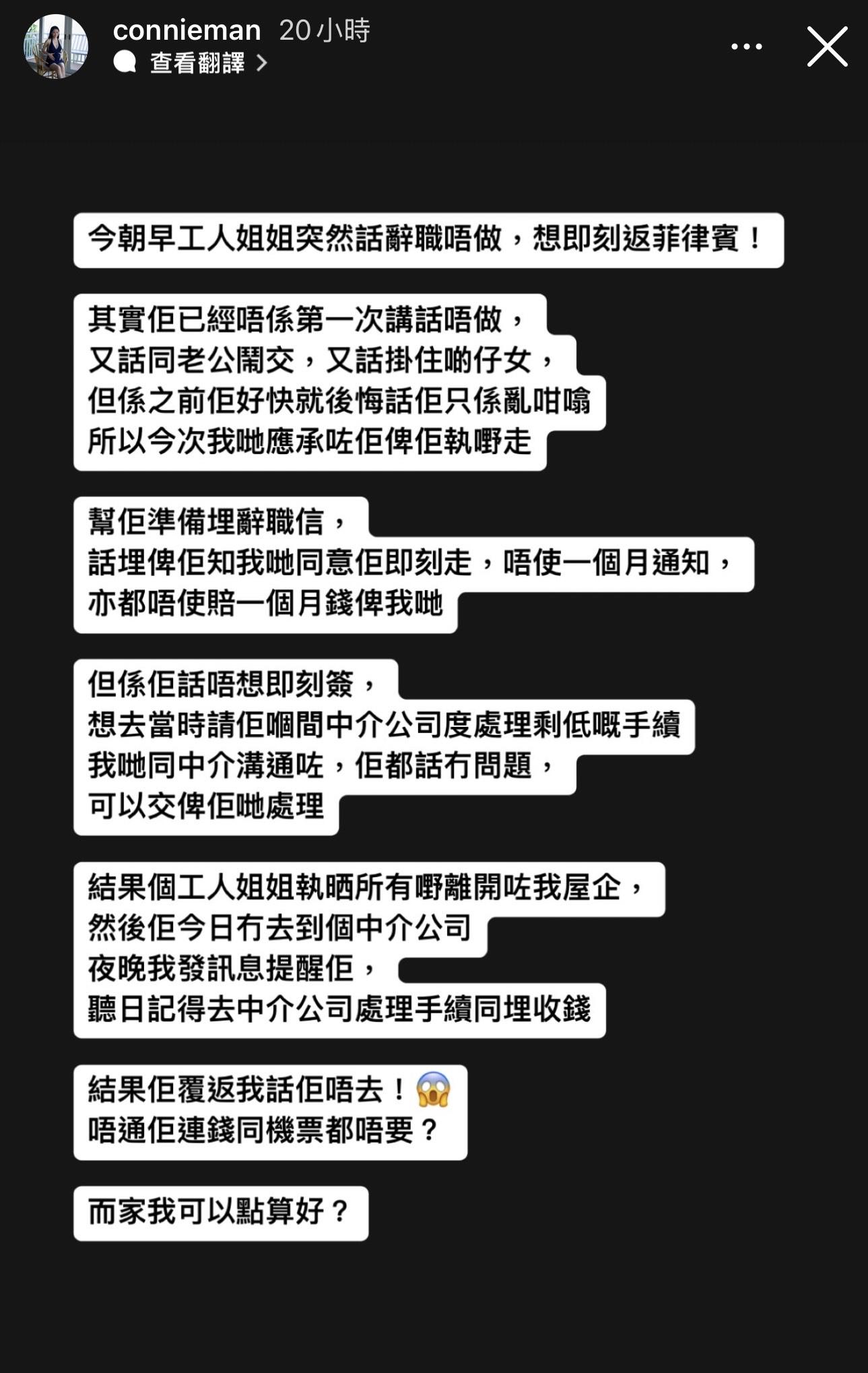 文凱玲在IG 限時動態以黑底白字寫下長文,她大感無助表示昨天早上工人姐姐突然話辭職唔做,想即刻返菲律賓:「其實佢已經唔係第一次講話唔做,又話同老公鬧交又話掛住啲仔女,但係之前佢好快就後悔話佢只係亂咁噏,所以今次我地應承咗佢畀佢執嘢走。幫佢準備埋辭職信,話埋俾佢知我地同意佢即刻走,唔使一個月通知亦都唔使賠一個月錢俾我地。」