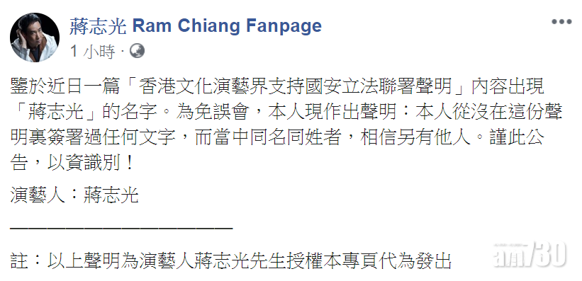 今日再到蔣志光透過粉絲專頁發聲明,否認曾有簽署刻則聲明︰「鑒於近日一篇『香港文化演藝界支持國安立法聯署聲明』內容出現『蔣志光』的名字。為免誤會,本人現作出聲明:本人從沒在這份聲明裏簽署過任何文字,而當中同名同姓者,相信另有他人。謹此公告,以茲識別!」