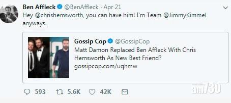 基斯就回覆表示 : 「對不起,這不關我事,麥迪文是Marvel的粉絲。」兩人你一言我一語,加上名嘴Jimmy Kimmel又「搭下咀」,搞到3個大男人好似小朋咁鬧交,超級英雄超級好笑。