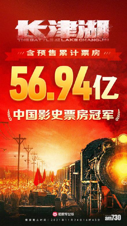 以「抗美援朝」時期第二次戰役「長津湖戰役」為主題的電影《長津湖》,自9月30日在內地開畫以來一直人氣高企,到今日下午4時43分,包括預售票的內地總票房已超過56.94億元(人民幣,下同),超越《戰狼2》,成為中國電影史上票房冠軍。