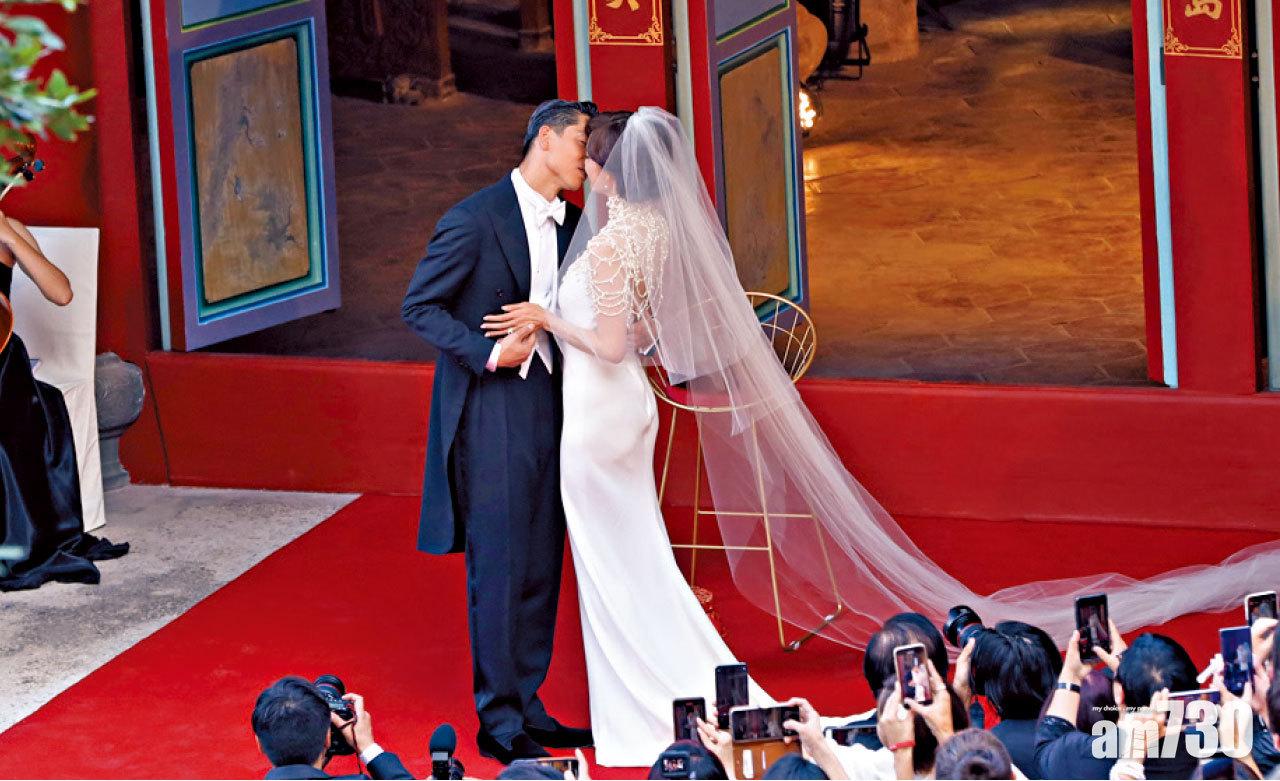 一對新人在眾人見證下,多次親吻,場面溫馨。