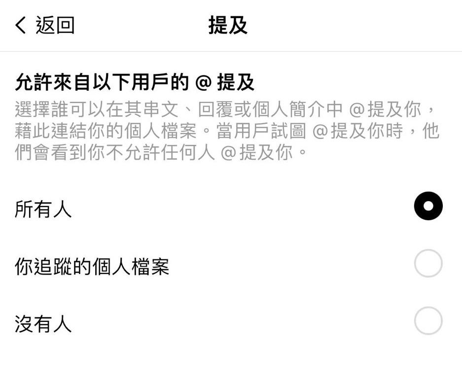 點擊 Threads 個人檔案左上角的圖示,然後點擊「提及」以選擇誰可以在其串文、回覆和個人簡介中提及自己,選項包括「所有人」、「追蹤的個人檔案」或「沒有人」。