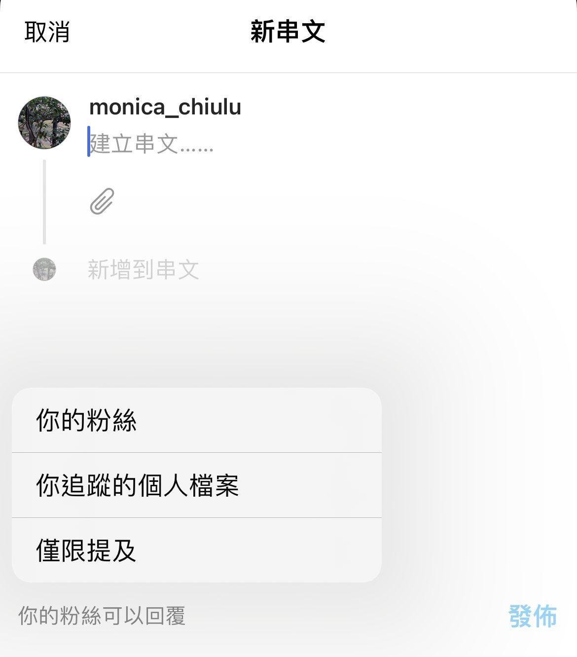 在發布Threads之前,用戶可決定誰能夠回覆該串文,三大選項包括「你的粉絲」、「你追蹤的個人檔案」和「僅限提及」。